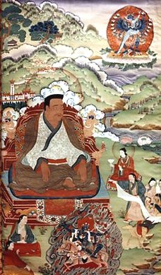 Marpa's human manifestation, like Hevajra, was a daunting and wrathful one. Never a monk, he lived with his consort, Damema (whose name, tellingly, is the Tubetan translation of Nairatmya, Hevajra's consort, and means non-ego). Marpa was responsible for conveying the mahamudra teachings from India to Tibet. He is therefore the Tibetan founder of the Kagyu lineage, which is often called the Marpa Kagyu in his honour. As his life work involved translating - both in the narrow linguistic sense and in the larger sense of creating a bridge between the Indian and Tibetan cultures - he is known as Marpa Lotsawa: Marpa the Translator. He was born in 1012 in the southern part of Tibet known as Lhodak. His father was Wangchuk Oser and his mother Gyamo Sa Dode. He was one of four sons. From birth Marpa was very strong of character, powerful in presence and full of energy. His overwhelming, natural magnetism made even his own parents unable to look him directly in the eyes. His clarity of mind and innate wisdom showed even as a child. He understood and immediately memorised whatever his first teacher, Lugyepa, taught him. His presence is said to have been not only awesome but also quite aggressive. The local villagers were frightened of him and kept their distance. This aggressiveness, fearful appearance and unpopularity led his father to send him far away to continue his education, to a teacher known as Drokmi the Translator. Marpa learnt Tibetan grammar, poetry and drama from him over a period of some 15 years and became a master not only of Tibetan but also of Indian languages and dialects. Marpa then returned home. He had decided to go to Nepal for further study, even though the journey would be long, hard, and dangerous. He persuaded his father to give him his share of the family wealth, in return for a promise to stay forever away from the family and the village. He travelled to nepal and remained there for some three years (near present-day Parping), learning more about India and its languages. He also heard of Naropa, one of the most famous scholars and masters of meditation, who was living in India and determined to go to him. It was a difficult business travelling from small kingdom to small kingdom in India (which was not a single country at the time but many independent areas ruled by local rajas ]. There were thieves, wild animals and 'customs' officers who demanded heavy tolls before giving the right to leave a territory. Despite all these difficulties, Marpa prevailed and met his teacher, studying 16 years and 7 months at his feet. For some 40 years, of which half were spent travelling in India, he translated the teachings he discovered into Tibetan. Moreover, he practised them until full attainment of their meaning was achieved. This made him able to translate them in every sense, across cultural barriers, in a way which would implant them authentically into their new land. Because of the hardships that Marpa was willing to go through, all the Kagyu traditions and teachings went to Tibet and are now filling the world. Without him they would not be available; without him the Kagyu tradition would not exist. In all, Marpa visited India three times. |